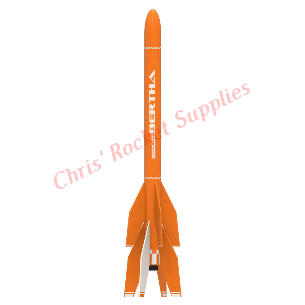 Experience the ultimate multistage flying model rocket with Boosted Bertha! This sport rocket at its core will soar to new heights, reaching altitudes of 1000 feet powered by Estes C6-0 and C6-5 engines. Watch as the booster jettisons and gently tumbles back to earth, while the colorful 18 inch parachute deploys to provide a light landing for quick preparation of another launch.