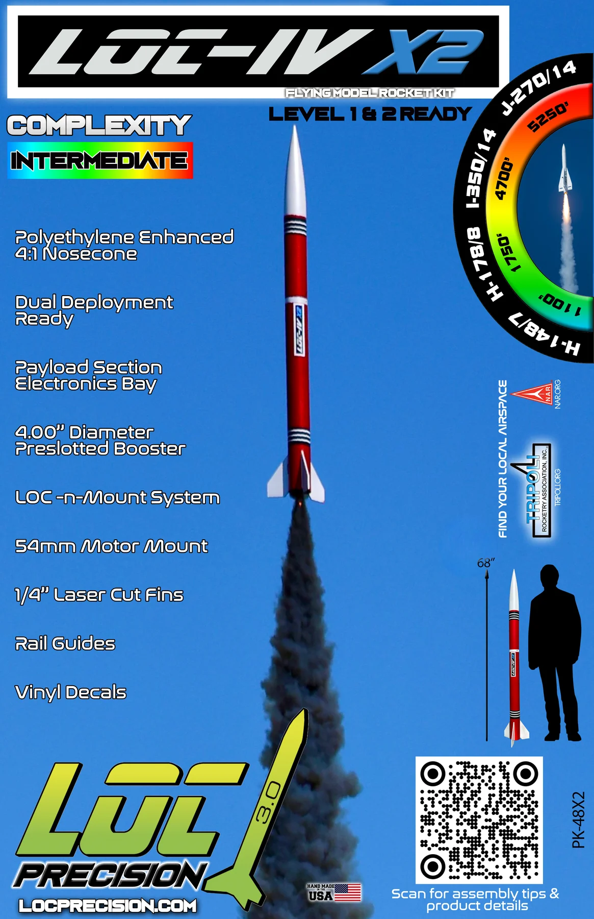 The LOC-IV X2 is the evolution of the best selling high power kit of all time, the LOC IV. This is the perfect platform to achieve both your L1 and L2 certifications! The included LNRMMA38 38mm adapter gives you the versatility to fly on various 38mm and 54mm motors. Want to get into dual deployment? The electronics bay offers you that option right out of the box! With its 1/4" fins and LOC-n-Mount system, you can build the fin can outside the airframe for the ultimate in strength and durability. Level up in style with the X2!