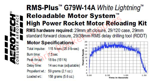This RMS motor reload utilizes RCSs exclusive White Lightning™ aerospace grade composite propellant formulation, which produces a gorgeous bright white flame with lots of dense white smoke and a throaty roar at lift-off.