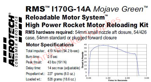This RMS motor reload utilizes RCSs exclusive Mojave Green™ aerospace grade composite propellant formulation, which produces a brilliant green exhaust plume with a moderate amount of smoke. Mojave Green™ motors high density and specific impulse delivers a higher total impulse in each motor size than any other AeroTech propellant.