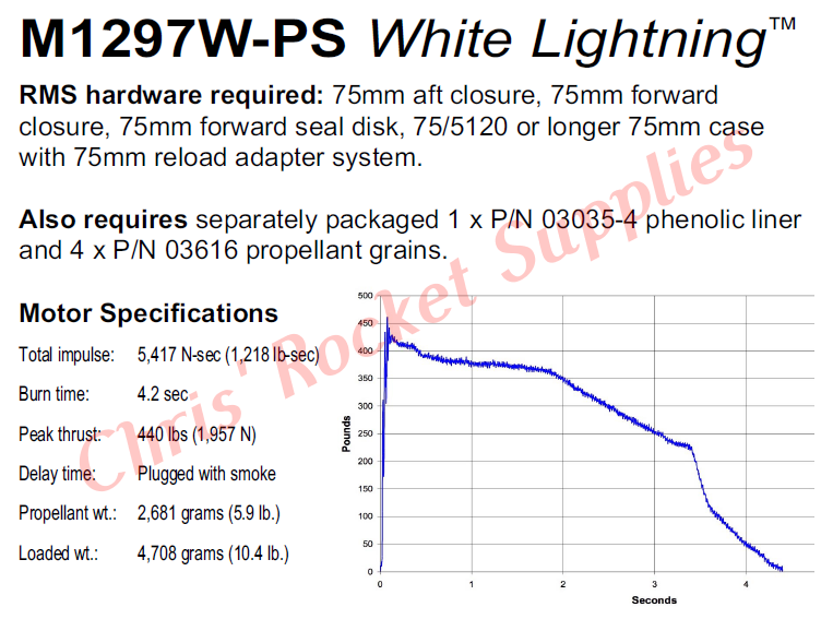 This RMS motor reload utilizes RCSs exclusive White Lightning™ aerospace grade composite propellant formulation, which produces a gorgeous bright white flame with lots of dense white smoke and a throaty roar at lift-off.