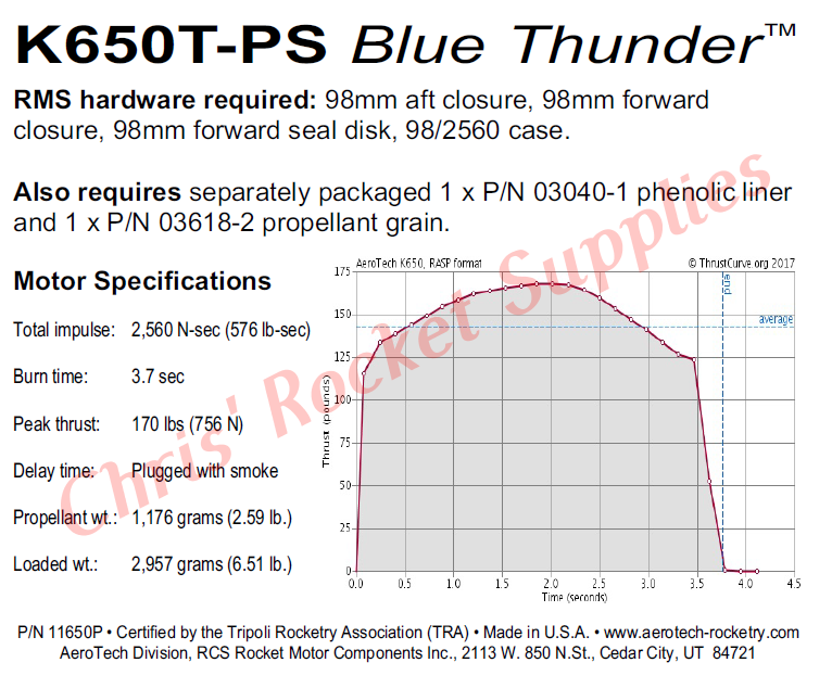 This RMS motor reload utilizes RCSs exclusive Blue Thunder™ aerospace grade composite propellant formulation, which produces a gorgeous bright violet-blue flame with a minimum of exhaust smoke. Blue Thunder™ motors provide a higher level of thrust than White Lightning™ motors of the same total impulse and are perfect for high lift-off acceleration.