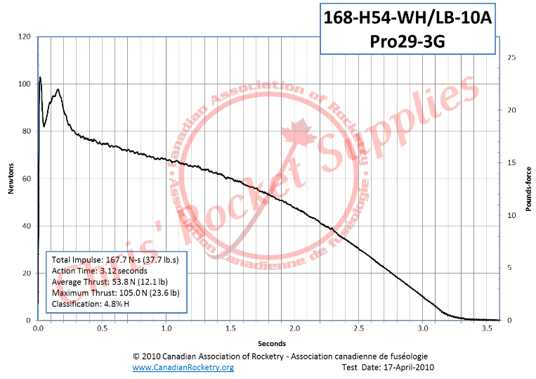 Brandname | Pro29 168H54-10A | Manufacturer | Cesaroni Technology | Man. Designation | 168H54-10A | CAR Designation | 168-H54-10A | Test Date | 4/17/2010 | | | Single-Use/Reload/Hybrid | Reloadable | Motor Dimensions mm | 29.00 x 187.00 mm (1.14 x 7.36 in) | Loaded Weight | 209.0 g | Total Impulse | 167.7 Ns (37.7 lb-s) | Propellant Weight | 96.6 g | Maximum Thrust | 105.0 N (23.6 lb) | Burnout Weight | 105.2 g | Avg Thrust | 53.8 N (12.1 lb) | Delays Tested | "10,7,5,3" | ISP | 176.99 s | Samples per second | 1000 | Burntime | 3.12 s | Notes | White Longburn™ |