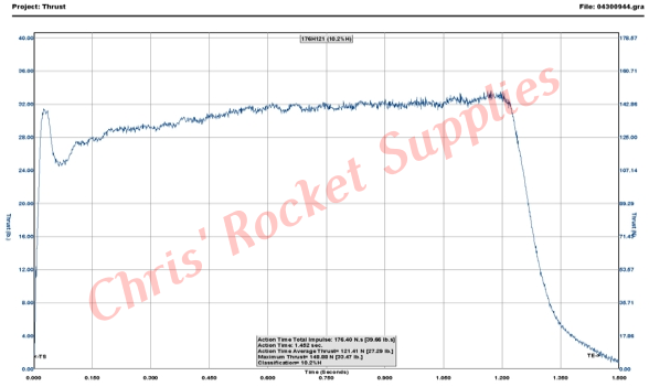 Brandname | Pro29 176H123-12A | Manufacturer | Cesaroni Technology | Man. Designation | 176H123-12A | CAR Designation | 176-H123-12A | Test Date | 5/4/2009 | | | Single-Use/Reload/Hybrid | Reloadable | Motor Dimensions mm | 29.00 x 231.00 mm (1.14 x 9.09 in) | Loaded Weight | 228.00 g (7.98 oz) | Total Impulse | 176.50 Ns (39.71 lb/s) | Propellant Weight | 100.00 g (3.50 oz) | Maximum Thrust | 149.80 N (33.71 lb) | Burnout Weight | 122.00 g (4.27 oz) | Avg Thrust | 123.00 N (27.68 lb) | Delays Tested | "12,9,7,5,3" | ISP | 179.97 s | Samples per second | 1000 | Burntime | 1.44 s | Notes | Skidmark™ |