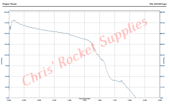 Brandname | Pro38 1115J530-15A | Manufacturer | Cesaroni Technology | Man. Designation | 1115J530-15A | CAR Designation | 1115-J530-15A | Test Date | 1/5/2009 | | | Single-Use/Reload/Hybrid | Reloadable | Motor Dimensions mm | 38.00 x 500.00 mm (1.50 x 19.67 in) | Loaded Weight | 977 g (34.46 oz) | Total Impulse | 1115.5 Ns (250.77 lb.s) | Propellant Weight | 576.5 g (20.34 oz) | Maximum Thrust | 828.8 N (186.32 lb) | Burnout Weight | 352 g (12.42 oz) | Avg Thrust | 531.2 N (119.42 lb) | Delays Tested | "15,12,10,8,6" | ISP | 197.30 s | Samples per second | 1000 | Burntime | 2.100 s | Notes | Imax™ |