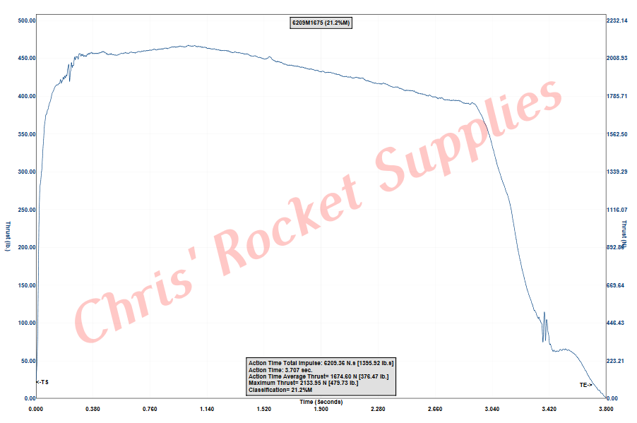 Brandname | Pro75 6162M1675-P | Manufacturer | Cesaroni Technology | Man. Designation | 6162M1675-P | CAR Designation | 6162-M1675-P | Test Date | 10/25/2009 | | | Single-Use/Reload/Hybrid | Reloadable | Motor Dimensions mm | 75.00 x 757.00 mm (2.95 x 29.80 in) | Loaded Weight | 5223 g | Total Impulse | 6162.0 Ns (1385.3 lb-s) | Propellant Weight | 3019 g | Maximum Thrust | 2185.9 N (491.4 lb) | Burnout Weight | 2064 g | Avg Thrust | 1674.1 N (376.4 lb) | Delays Tested | plugged | ISP | 208.16 s | Samples per second | 1000 | Burntime | 3.68 s | Notes | 20.4% M |
