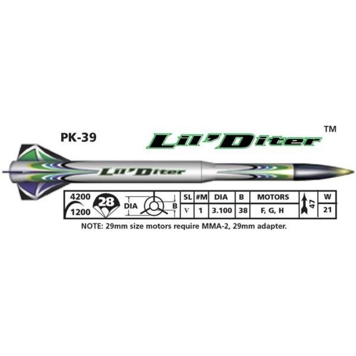 ADVANCED SERIES which include factory pre-slotted airframe and through-the-wall fin construction, the Lil DITER is a slightly smaller version of our famous EXPEDITER kit that performs beautifully on a variety of different F and G motors through Level 1 H motors. Lil DITER is a sure to be an attention getter at your next launch Parachute Recovery.