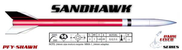 Our Park Flyer series of kits are a low-cost, durable and all-inclusive line. Made for the small field, they're super strong and can be brought down quickly minimizing drift on recovery. At 36" tall and weighing in at 13oz dry weight, the Sandhawk comes with a 17" booster section, 11" payload, 29mm motor mount, 18" rip-stop nylon parachute, kevlar shock cord mount and fire resistant blanket! They can easily fly on D-H impulse. Call or E-mail for bulk pricing!