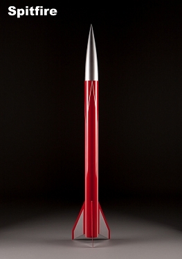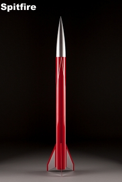 The SPITFIRE is a great kit for Level 1 and 2 flights. This rocket stands 50.7" tall, is 3.1" in diameter and has a 3 fin design. This rocket comes standard with a 38mm motor mount and can fly on G thru J motors. At ~41 oz., the 36" parachute is sized right for the stock kit to make a safe landing under most field conditions. This kit comes standard with our exclusive Linear Rail Lugs for use with 80/20 brand launch rails. The stock airframe is ideal for flights up to approx. 0.85 Mach.
