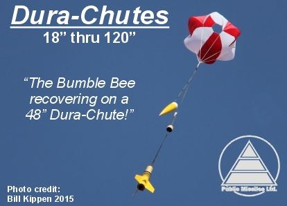 Parachute Sizing Upgrades -- PML chutes are sized for Midwestern and Eastern flying, as opposed to the open areas and hard landing surfaces of many Western sites. We size our chutes for minimal drift for smaller landing sites, while still allowing a safe descent rate into the grassy areas prevalent in the Midwest and East. However, if you`re flying in Western areas where drift is not as much a concern and where landing areas are harder (such as desert playa), or if you`re flying from high-elevation launch sites with lower-density air, we can upsize the chute in your kit. Upgrade pricing will vary depending upon the base and upgrade chute. As always, just ask when you order...PML will work with you on anything you`d like to do, kit or scratchbuild.