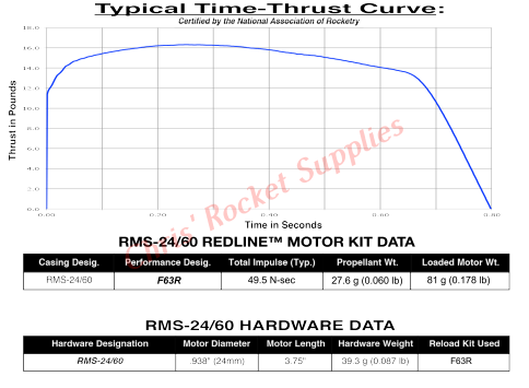 The AeroTech Reloadable Motor System RMS is an aluminum cased reusable motor in kit form that is assembled by the user. You will need AeroTech RMS-24/60 motor hardware to build and complete the motor for many reliable flights. Motor hardware is available separately in a complete set, and also as individual parts. Important: Mid Power RMS reload kits are not compatible with High Power RMS products. This RMS motor reload utilizes RCSs exclusive Redline™ aerospace grade composite propellant formulation, which produces a visible scarlet flame. Redline™ motors burning rate lies midway between that of White Lightning™ and Blue Thunder™. Photos don’t do justice to the “laser-beam” intensity and color of Redline™…. you have to see it to appreciate it!