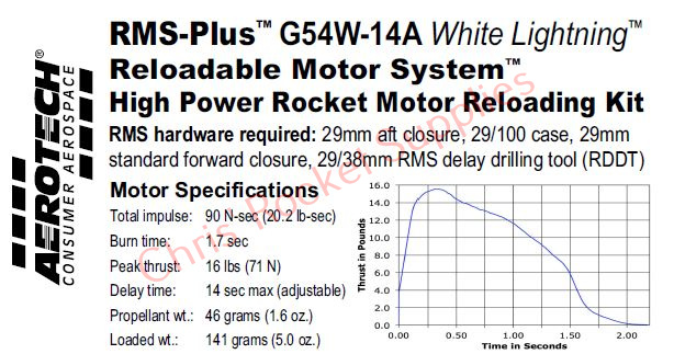 This RMS motor reload utilizes RCSs exclusive White Lightning™ aerospace grade composite propellant formulation, which produces a gorgeous bright white flame with lots of dense white smoke and a throaty roar at lift-off.