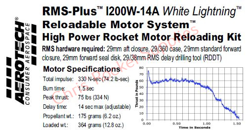 This RMS motor reload utilizes RCSs exclusive White Lightning™ aerospace grade composite propellant formulation, which produces a gorgeous bright white flame with lots of dense white smoke and a throaty roar at lift-off.