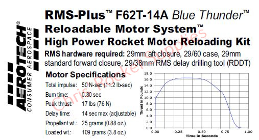 This RMS motor reload utilizes RCSs exclusive Blue Thunder™ aerospace grade composite propellant formulation, which produces a gorgeous bright violet-blue flame with a minimum of exhaust smoke. Blue Thunder™ motors provide a higher level of thrust than White Lightning™ motors of the same total impulse and are perfect for high lift-off acceleration.