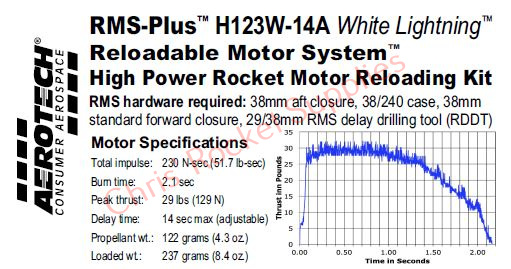 This RMS motor reload utilizes RCSs exclusive White Lightning™ aerospace grade composite propellant formulation, which produces a gorgeous bright white flame with lots of dense white smoke and a throaty roar at lift-off.