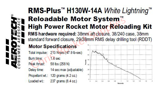 This RMS motor reload utilizes RCSs exclusive White Lightning™ aerospace grade composite propellant formulation, which produces a gorgeous bright white flame with lots of dense white smoke and a throaty roar at lift-off.