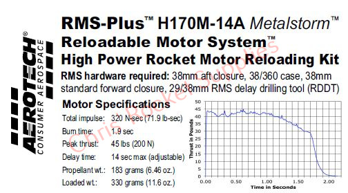 This RMS motor reload utilizes RCSs exclusive Metalstorm™ aerospace grade composite propellant formulation. Metalstorm™ is a sparky propellant, lights easily and produces a large brilliant white exhaust plume, a long yellow-orange dense spark trail, and plentiful white sparks that fan out in flight. As with all rocket motors using spark-generating propellants, special precautions must be taken to avoid fires around the launch pad by clearing the immediate area of all combustible materials in accordance with applicable fire and safety codes.