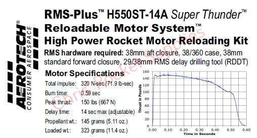 This RMS motor reload utilizes RCSs exclusive Super Thunder™ aerospace grade composite propellant formulation, which produces a bright violet-blue flame with a minimum of exhaust smoke. Super Thunder™ motors provide a higher ISP than Blue Thunder™.