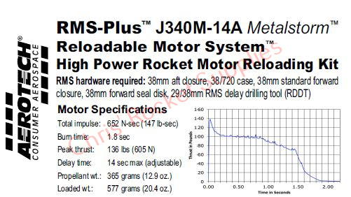 This RMS motor reload utilizes RCSs exclusive Metalstorm™ aerospace grade composite propellant formulation. Metalstorm™ is a sparky propellant, lights easily and produces a large brilliant white exhaust plume, a long yellow-orange dense spark trail, and plentiful white sparks that fan out in flight. As with all rocket motors using spark-generating propellants, special precautions must be taken to avoid fires around the launch pad by clearing the immediate area of all combustible materials in accordance with applicable fire and safety codes.
