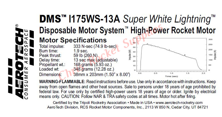 DMS motors feature a filament-wound fiberglass casing, a glass-reinforced composite phenolic nozzle, a molded plastic bulkhead and RCSs exclusive Super White Lightning™ aerospace grade composite propellant formulation, which produces a brilliant white flame with lots of dense white smoke and a throaty roar at lift-off. Super White Lightning™ has a higher specific impulse, a higher density and a higher burn rate than White Lightning™ propellant.