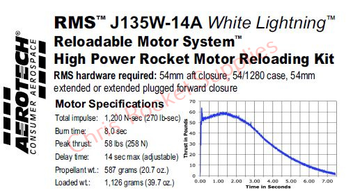 This RMS motor reload utilizes RCSs exclusive White Lightning™ aerospace grade composite propellant formulation, which produces a gorgeous bright white flame with lots of dense white smoke and a throaty roar at lift-off.