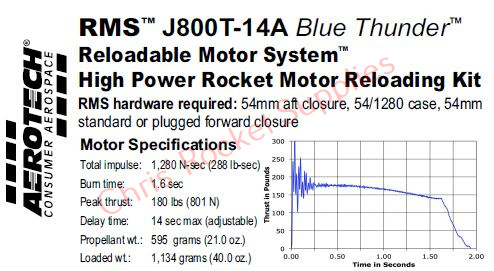 This RMS motor reload utilizes RCSs exclusive Blue Thunder™ aerospace grade composite propellant formulation, which produces a gorgeous bright violet-blue flame with a minimum of exhaust smoke. Blue Thunder™ motors provide a higher level of thrust than White Lightning™ motors of the same total impulse and are perfect for high lift-off acceleration.