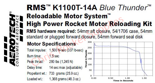 This RMS motor reload utilizes RCSs exclusive Blue Thunder™ aerospace grade composite propellant formulation, which produces a gorgeous bright violet-blue flame with a minimum of exhaust smoke. Blue Thunder™ motors provide a higher level of thrust than White Lightning™ motors of the same total impulse and are perfect for high lift-off acceleration.