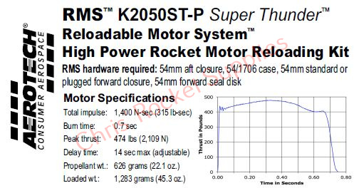 The K2050ST-P is a Plugged motor reload. Plugged reload kits do not utilize a motor-actuated delay or ejection charge. Plugged motors must be used in conjunction with a timer, altimeter or radio-activated recovery system.