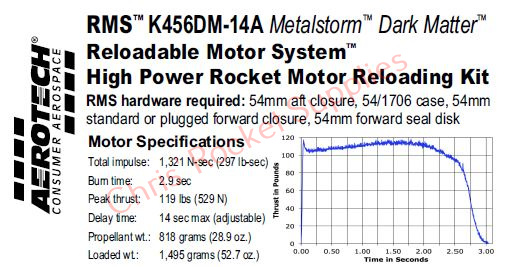 This RMS motor reload utilizes RCSs exclusive Dark Matter™ aerospace grade composite propellant formulation. Dark Matter™ is a sparky propellant, but unlike Metalstorm™ with its higher ISP and white smoke, Dark Matter™ is a black smoke sparky motor. As with all rocket motors using spark-generating propellants, special precautions must be taken to avoid fires around the launch pad by clearing the immediate area of all combustible materials in accordance with applicable fire and safety codes.