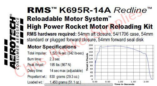 The AeroTech Reloadable Motor System RMS is an aluminum cased reusable motor in kit form that is assembled by the user. You will need AeroTech RMS-54/1706 motor hardware to build and complete the motor for many reliable flights. Motor hardware is available separately in a complete set, and also as individual parts. This motor requires installing a forward seal disc (54FSD) during assembly. Important: High Power RMS reload kits are not compatible with Mid Power RMS products. You will need to set the desired delay time using the 54mm Delay Drilling Tool (54RDDT), not included.