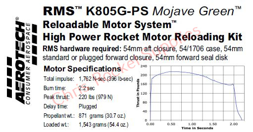 The K805G-PS is a Plugged/Smoke motor reload. Plugged reload kits do not utilize a motor-actuated delay or ejection charge. Plugged motors must be used in conjunction with a timer, altimeter or radio-activated recovery system.