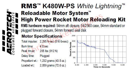 This RMS motor reload utilizes RCSs exclusive White Lightning™ aerospace grade composite propellant formulation, which produces a gorgeous bright white flame with lots of dense white smoke and a throaty roar at lift-off.