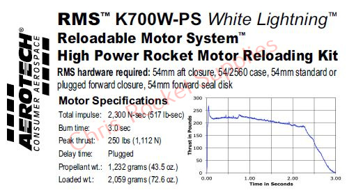 This RMS motor reload utilizes RCSs exclusive White Lightning™ aerospace grade composite propellant formulation, which produces a gorgeous bright white flame with lots of dense white smoke and a throaty roar at lift-off.