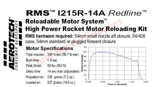 The AeroTech Reloadable Motor System RMS is an aluminum cased reusable motor in kit form that is assembled by the user. You will need AeroTech RMS-54/426 motor hardware to build and complete the motor for many reliable flights. Motor hardware is available separately in a complete set, and also as individual parts. This motor requires installing a 54mm small nozzle aft closure (54ACCSN) during assembly. Important: High Power RMS reload kits are not compatible with Mid Power RMS products. You will need to set the desired delay time using the 54mm Delay Drilling Tool (54RDDT), not included.