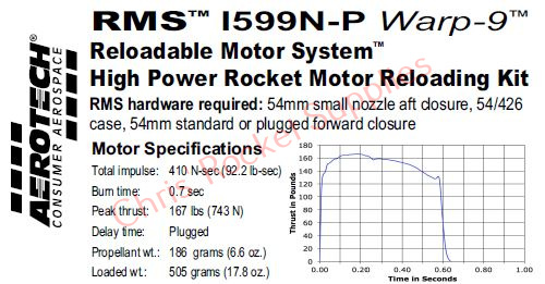 The I599N-P is a Plugged motor reload. Plugged reload kits do not utilize a motor-actuated delay or ejection charge. Plugged motors must be used in conjunction with a timer, altimeter or radio-activated recovery system.