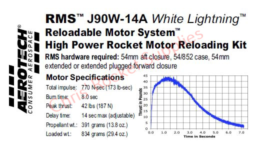 This RMS motor reload utilizes RCSs exclusive White Lightning™ aerospace grade composite propellant formulation, which produces a gorgeous bright white flame with lots of dense white smoke and a throaty roar at lift-off.