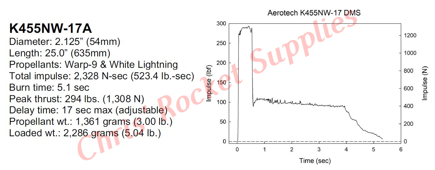 DMS motors feature a filament-wound fiberglass casing, a glass-reinforced composite phenolic nozzle, and a molded plastic bulkhead. This “boost-sustain” motor uses a combination of AeroTech’s Warp- 9™ and White Lightning™ propellants to produce a unique thrust curve with a brilliant white flame and a moderate amount of smoke. The “boost” portion of the thrust curve generates nearly 300 pounds of thrust for about 0.5 seconds, followed by a longer “sustain” phase of about 90 pounds.