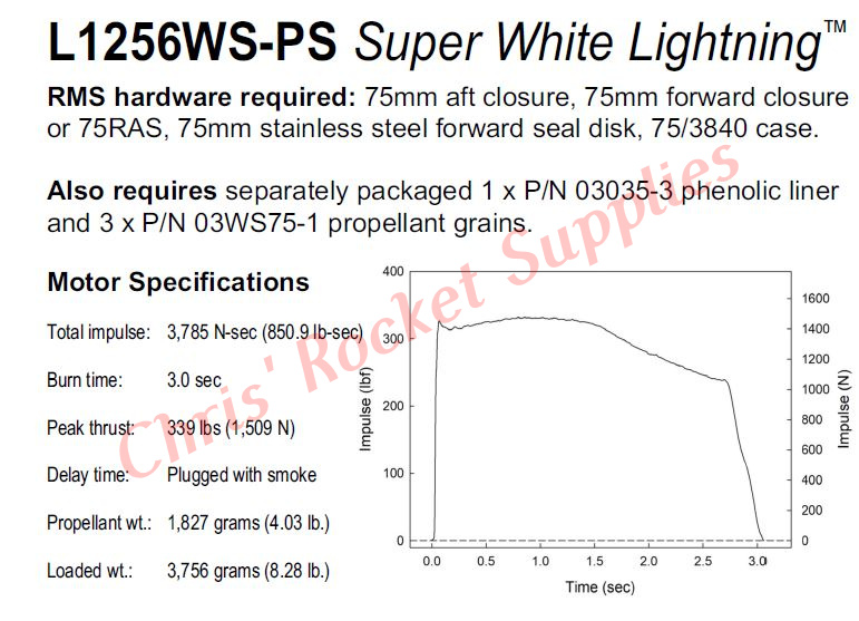 This RMS motor reload utilizes RCSs exclusive Super White Lightning™ aerospace grade composite propellant formulation, which produces a brilliant white flame with lots of dense white smoke and a throaty roar at lift-off. Super White Lightning™ has a higher specific impulse, a higher density and a higher burn rate than White Lightning™ propellant.