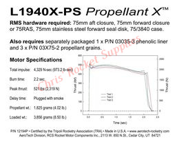 This RMS motor reload utilizes RCSs exclusive Propellant X™ aerospace grade composite propellant formulation, which is a high ISP propellant, and produces a bright white flame with a moderate amount of smoke.