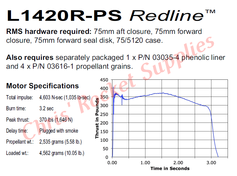 The L1420R-PS is a Plugged/Smoke motor reload. Plugged reload kits do not utilize a motor-actuated delay or ejection charge. Plugged motors must be used in conjunction with a timer, altimeter or radio-activated recovery system.