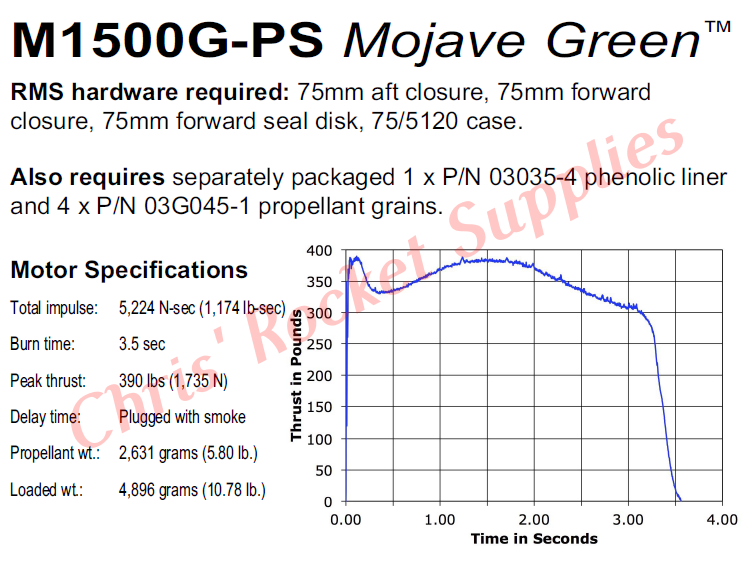 This RMS motor reload utilizes RCSs exclusive Mojave Green™ aerospace grade composite propellant formulation, which produces a brilliant green exhaust plume with a moderate amount of smoke. Mojave Green™ motors high density and specific impulse delivers a higher total impulse in each motor size than any other AeroTech propellant.