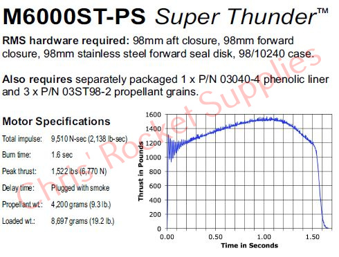 This RMS motor reload utilizes RCSs exclusive Super Thunder™ aerospace grade composite propellant formulation, which produces a bright violet-blue flame with a minimum of exhaust smoke. Super Thunder™ motors provide a higher ISP than Blue Thunder™.