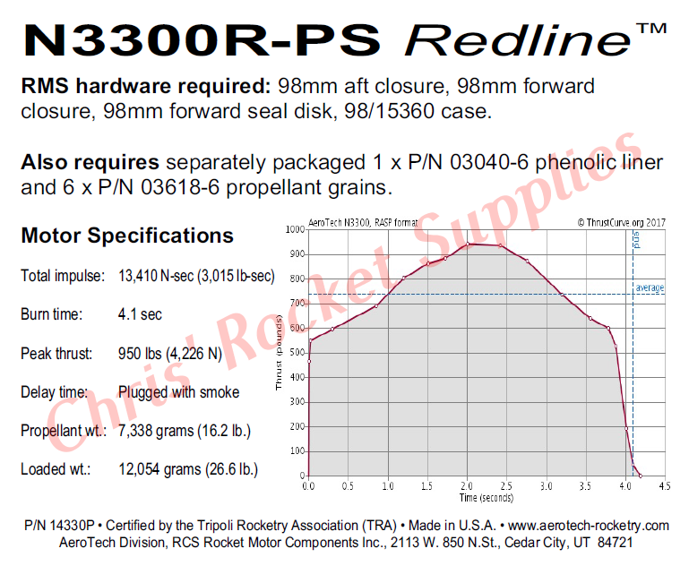 The N3300R-PS is a Plugged/Smoke motor reload. Plugged reload kits do not utilize a motor-actuated delay or ejection charge. Plugged motors must be used in conjunction with a timer, altimeter or radio-activated recovery system.