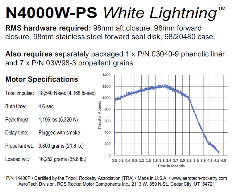 This RMS motor reload utilizes RCS' exclusive White Lightning™ aerospace grade composite propellant formulation.