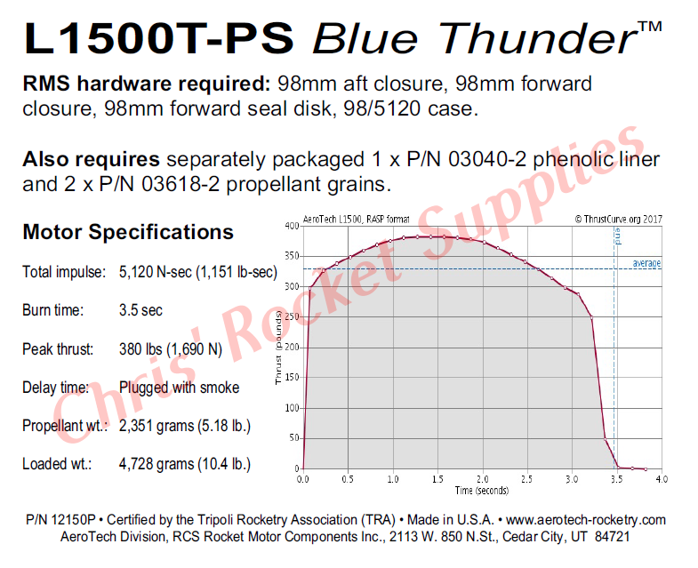 This RMS motor reload utilizes RCSs exclusive Blue Thunder™ aerospace grade composite propellant formulation, which produces a gorgeous bright violet-blue flame with a minimum of exhaust smoke. Blue Thunder™ motors provide a higher level of thrust than White Lightning™ motors of the same total impulse and are perfect for high lift-off acceleration.