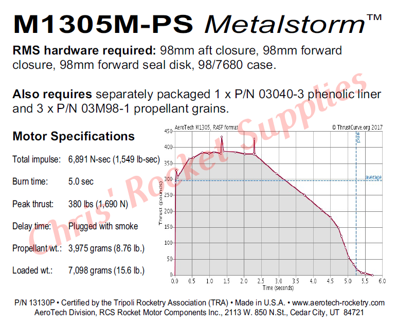 This RMS motor reload utilizes RCSs exclusive Metalstorm™ aerospace grade composite propellant formulation. Metalstorm™ is a sparky propellant, lights easily and produces a large brilliant white exhaust plume, a long yellow-orange dense spark trail, and plentiful white sparks that fan out in flight. As with all rocket motors using spark-generating propellants, special precautions must be taken to avoid fires around the launch pad by clearing the immediate area of all combustible materials in accordance with applicable fire and safety codes.