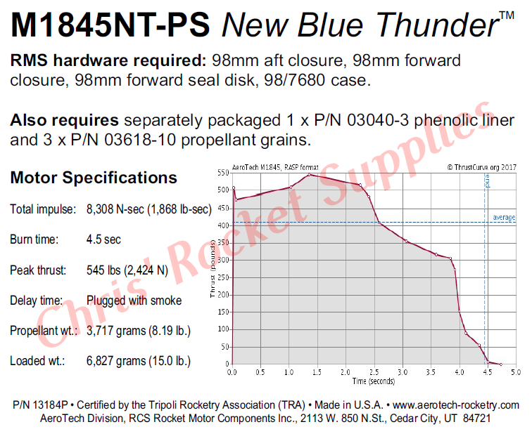This RMS motor reload utilizes RCSs exclusive New Blue Thunder™ aerospace grade composite propellant formulation, which produces a beautiful intense blue exhaust jet studded with prominent “mach diamonds.” New Blue Thunder™ motors provide a higher level of thrust than White Lightning™ motors of the same total impulse and are perfect for high lift-off acceleration.