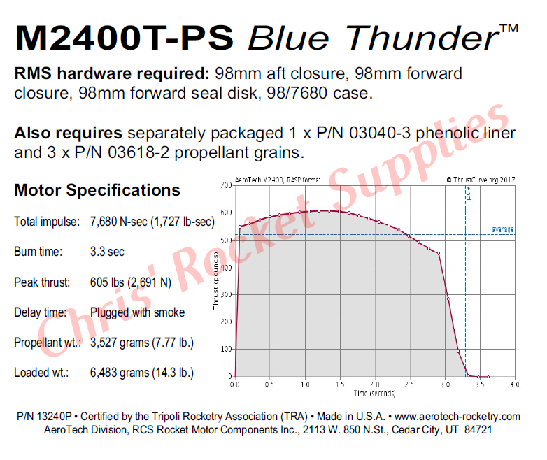 This RMS motor reload utilizes RCSs exclusive Blue Thunder™ aerospace grade composite propellant formulation, which produces a gorgeous bright violet-blue flame with a minimum of exhaust smoke. Blue Thunder™ motors provide a higher level of thrust than White Lightning™ motors of the same total impulse and are perfect for high lift-off acceleration.