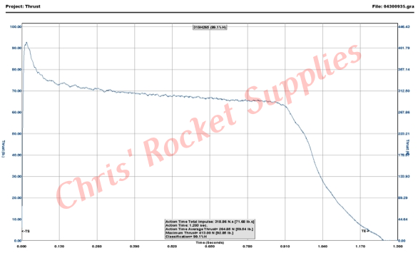 Brandname | Pro29 229H255-14A | Manufacturer | Cesaroni Technology | Man. Designation | 229H255-14A | CAR Designation | 229-H255-14A | Test Date | 5/4/2009 | | | Single-Use/Reload/Hybrid | Reloadable | Motor Dimensions mm | 29.00 x 231.00 mm (1.14 x 9.09 in) | Loaded Weight | 232.00 g (8.12 oz) | Total Impulse | 229.30 Ns (51.59 lb/s) | Propellant Weight | 104.30 g (3.65 oz) | Maximum Thrust | 363.00 N (81.67 lb) | Burnout Weight | 119.00 g (4.17 oz) | Avg Thrust | 254.30 N (57.22 lb) | Delays Tested | "14,11,9,7,5" | ISP | 224.14 s | Samples per second | 1000 | Burntime | 0.90 s | Notes | White Thunder™ |