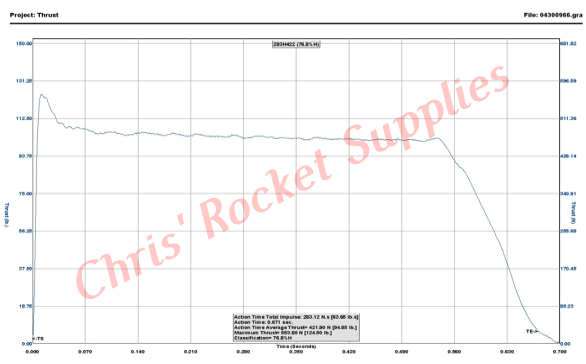 Brandname | Pro29 282H399-12A | Manufacturer | Cesaroni Technology | Man. Designation | 282H399-12A | CAR Designation | 282-H399-12A | Test Date | 5/4/2009 | | | Single-Use/Reload/Hybrid | Reloadable | Motor Dimensions mm | 29.00 x 320.00 mm (1.14 x 12.60 in) | Loaded Weight | 294.00 g (10.29 oz) | Total Impulse | 282.20 Ns (63.49 lb/s) | Propellant Weight | 132.60 g (4.64 oz) | Maximum Thrust | 545.80 N (122.80 lb) | Burnout Weight | 154.00 g (5.39 oz) | Avg Thrust | 399.30 N (89.84 lb) | Delays Tested | "12,9,7,5,3" | ISP | 217.02 s | Samples per second | 1000 | Burntime | 0.71 s | Notes | White Thunder™ |